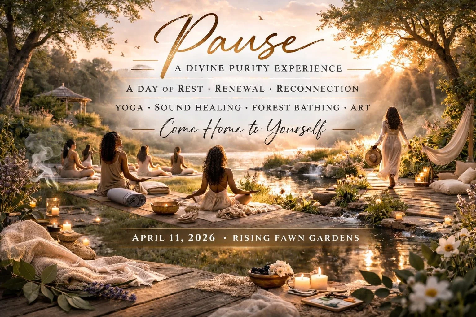 Set on the beautiful grounds of Rising Fawn Gardens, this experience combines gentle movement, sound, creative expression, guided forest immersion, and spacious time to simply be.